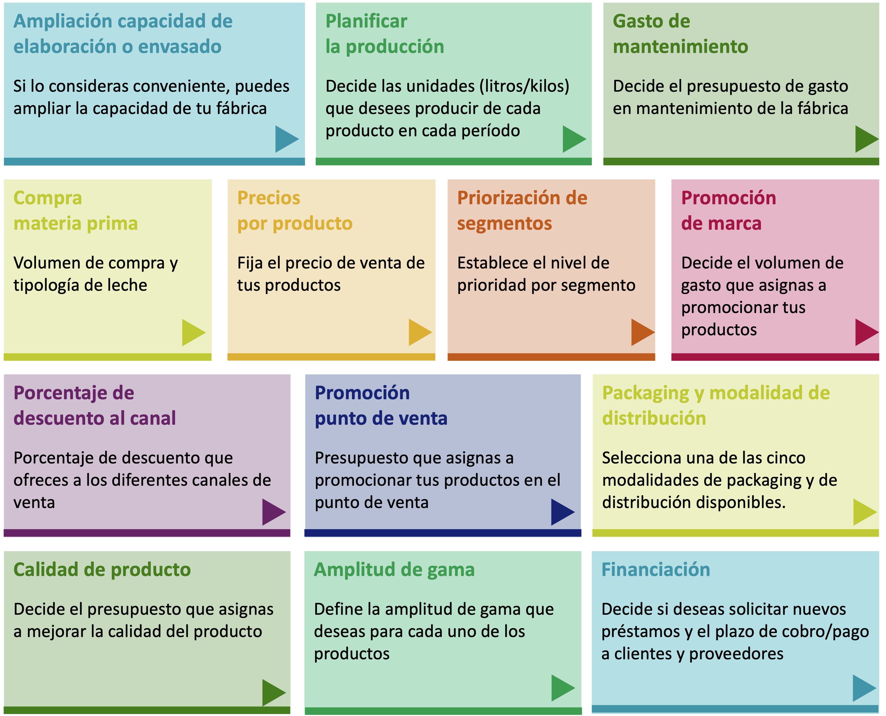 Los diferentes equipos deberán gestionar una empresa del sector lácteo que permite a los usuarios tomar diferentes decisiones de dirección en diferentes áreas clave de gestión empresarial. Además, deberán estar atentos a la evolución del entorno, pues puede influenciar de forma significativa en la evolución del negocio.